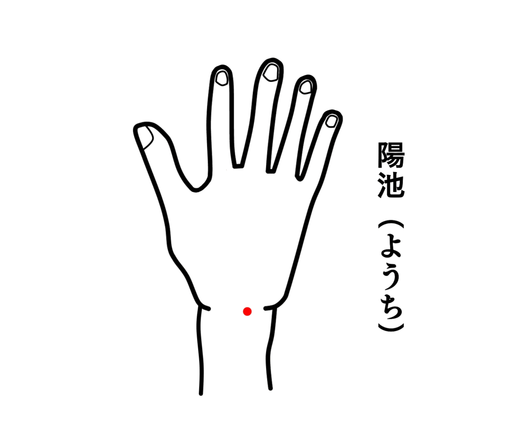 陽池(ようち)は、手の甲側、手首の関節にあるくぼみに位置するツボで、五十肩の改善にも効果が期待されています。手のひらを反らしてみると手首にシワができますが、その中央から少し小指側にあるくぼみを探してみてください。肩の痛みと一見関係なさそうな位置ですが、このツボは腕全体の気血の流れを良くし、肩までつながる経絡を整えてくれる大切なポイントです。肩が動きやすく、こわばりや重だるさがやわらぐことがあります。ツボを押すときは親指で気持ちよく感じるくらいの力で5秒ほどじんわり押して、ゆっくり離す、を数回繰り返しましょう。