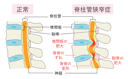 背骨の変形、背骨のズレ、椎間板や靭帯の肥大が原因となって、脊柱管が狭くなり神経を圧迫することが原因とされています。
